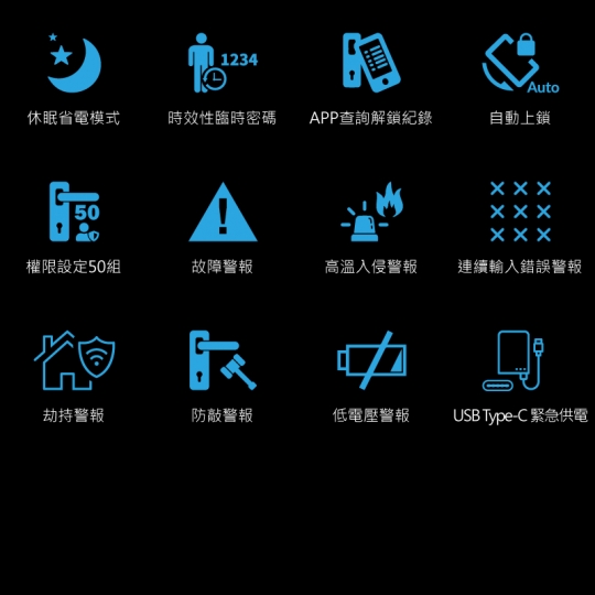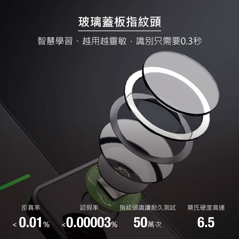 - 指紋設定數量:50組 可設定管理+主人+客人三種權限,合計最多支援50組,每組都能單獨刪除單獨增加。