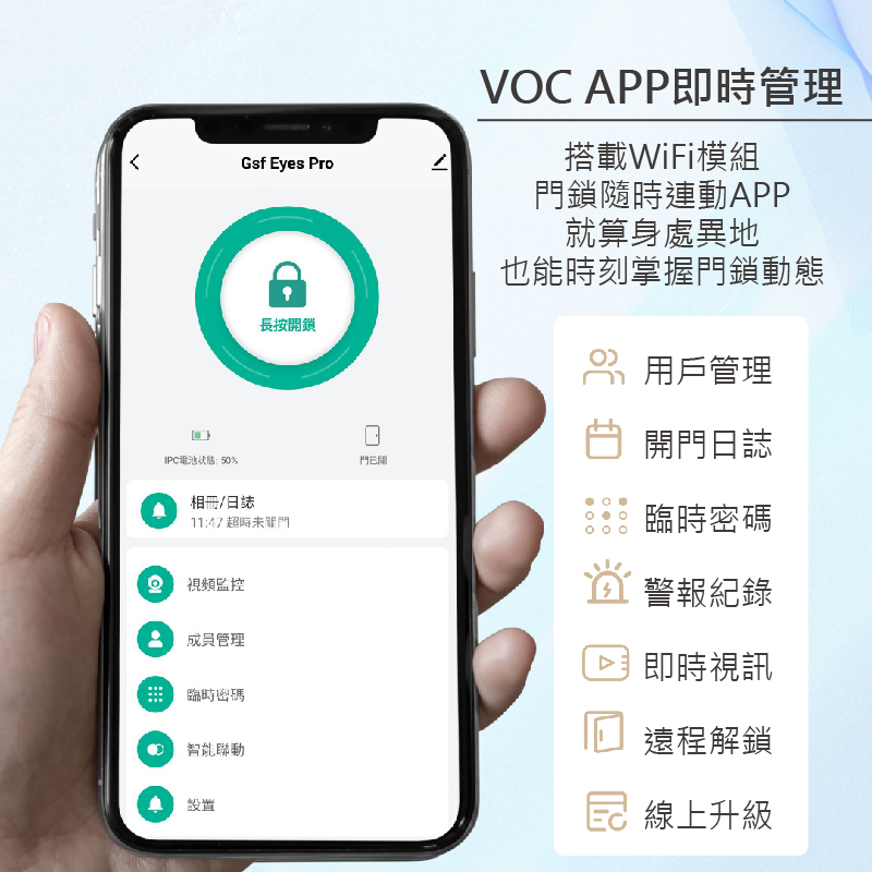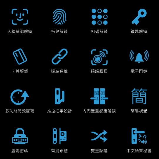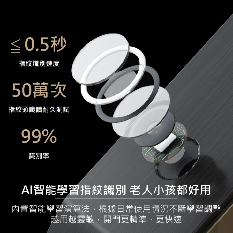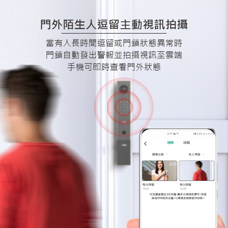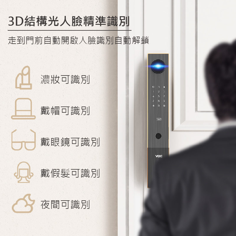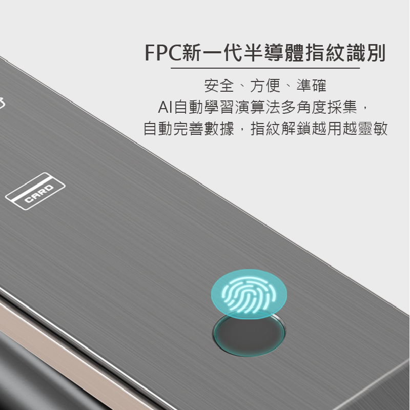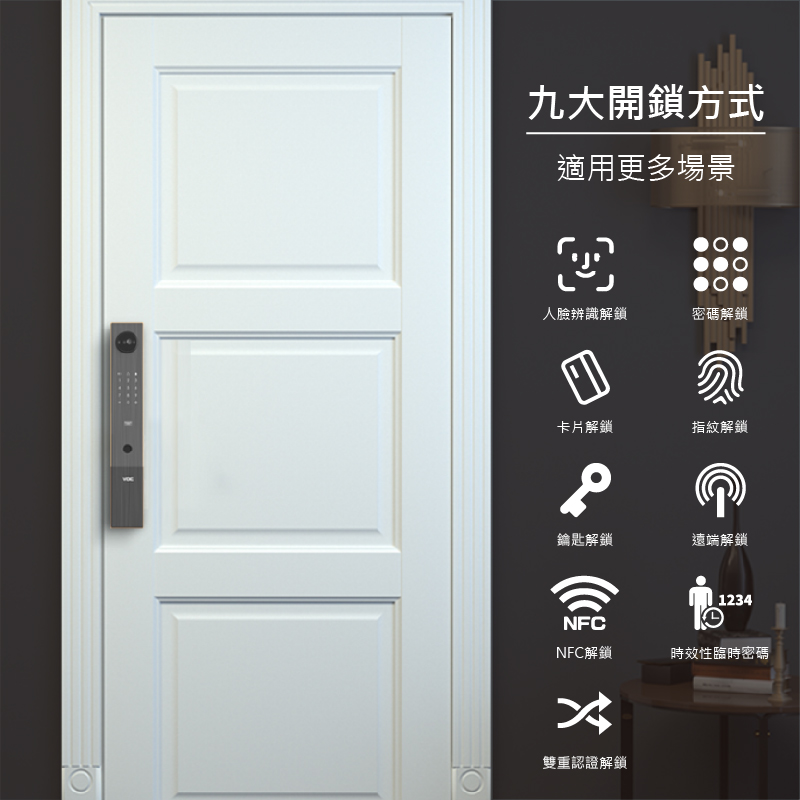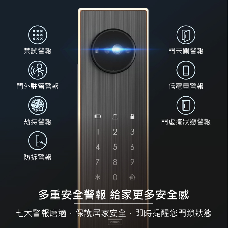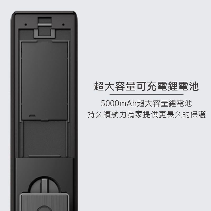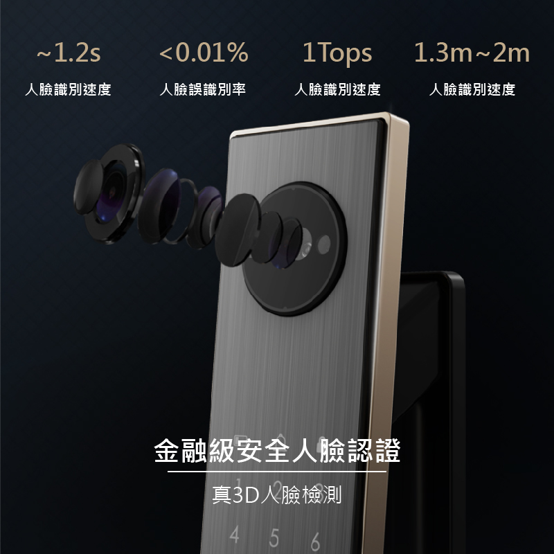 視訊鏡頭具備紅外線功能,可全天候看清門外視野,支援AI人臉識別演算法,能辨識各種面容資訊,下次使用時能更快速完成辨識,鎖體內建5,000mAh大容量鋰電池,充滿一次電約可使用 60 天,當電量過低時,手機App自動推播低電通知,內、外門鎖採用航空級別合金材質,面板表面採用IML工藝,霧面質感搭輔以絲紋理,不易沾染指紋和灰塵。同時搭配側邊的金屬色邊框,給人一種高貴精緻的感覺,適用市面上絕大多數的門扇。