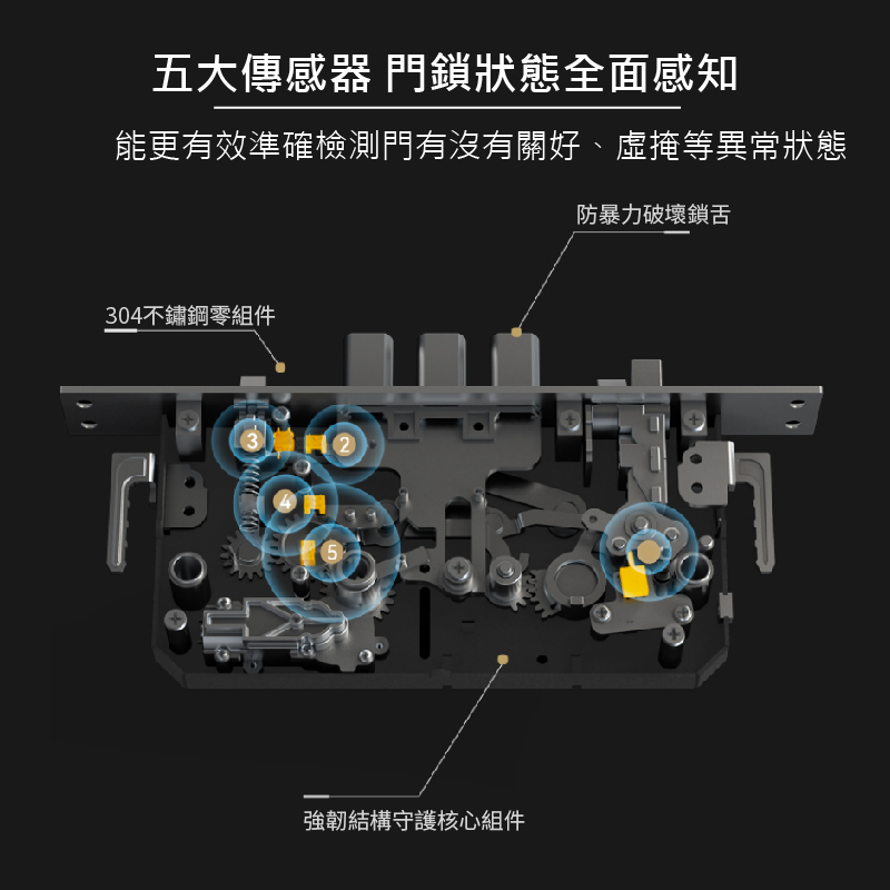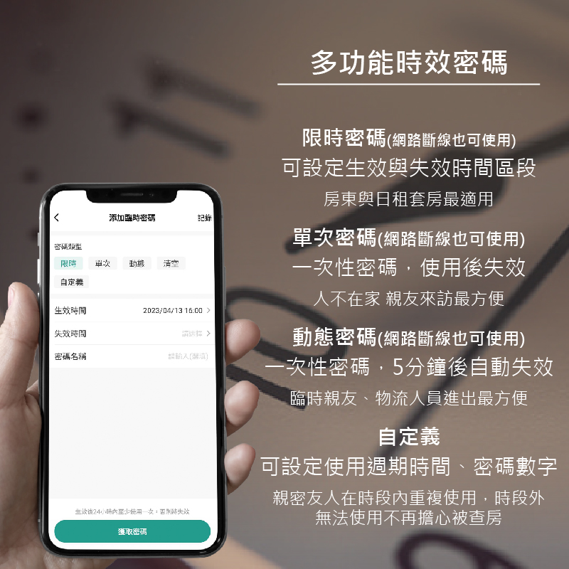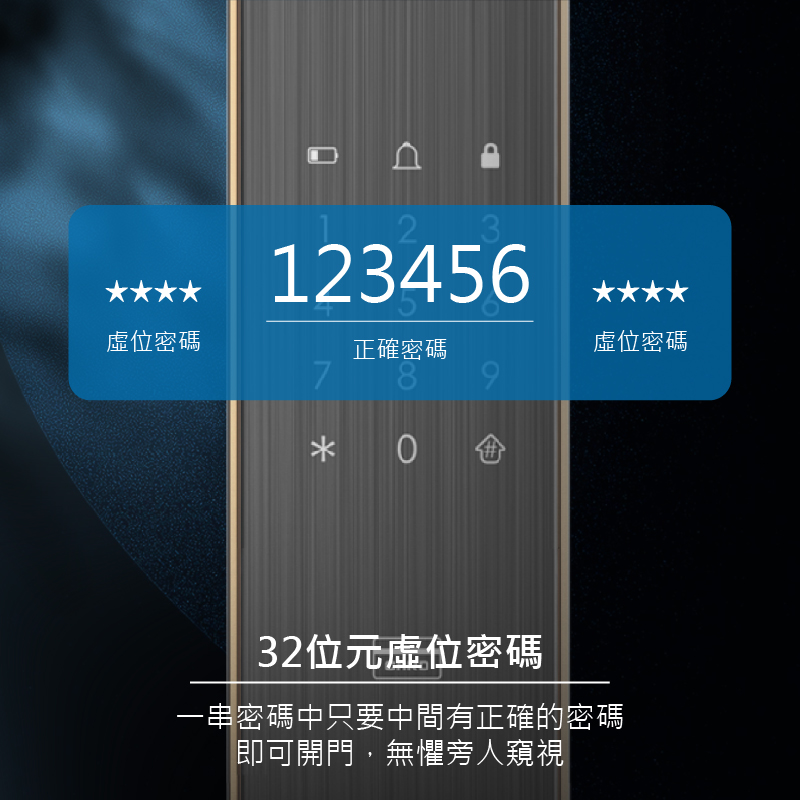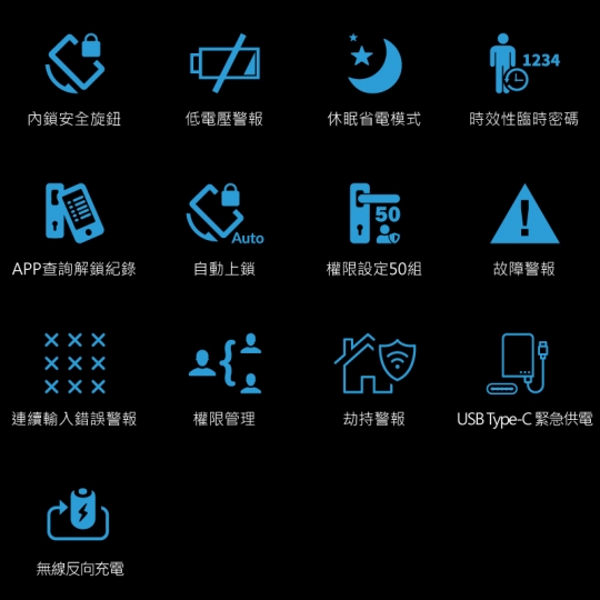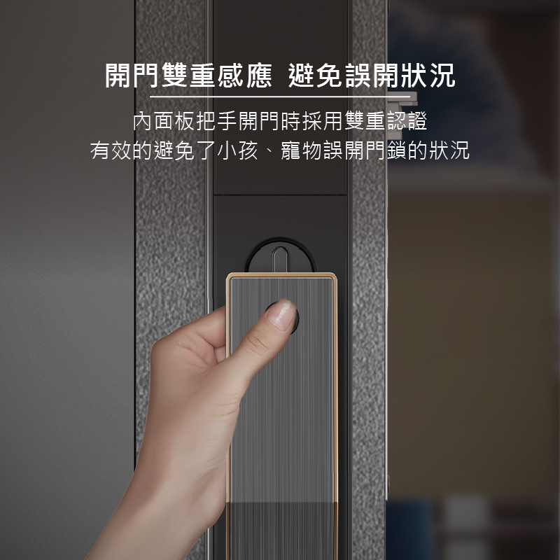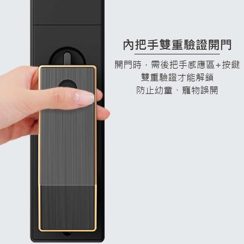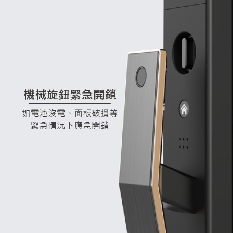 - 內鎖安全旋鈕,只有管理者及機械鑰匙可從外面打開
