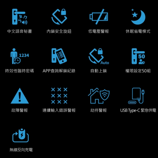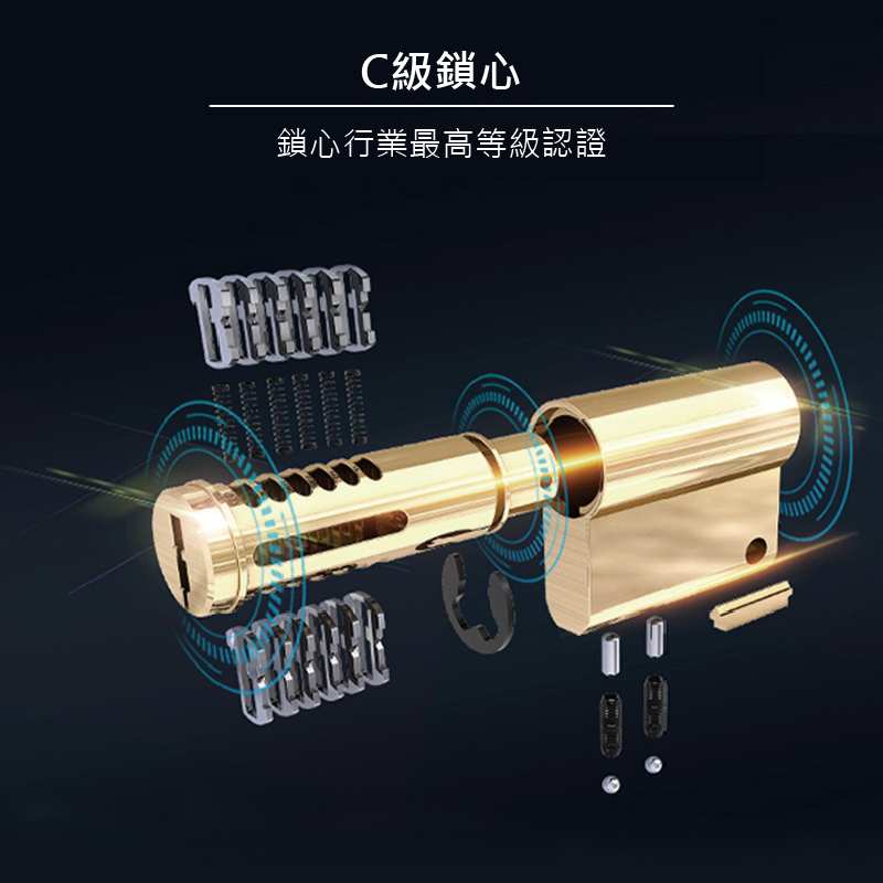- 內鎖安全旋鈕,只有管理者及機械鑰匙可從外面打開