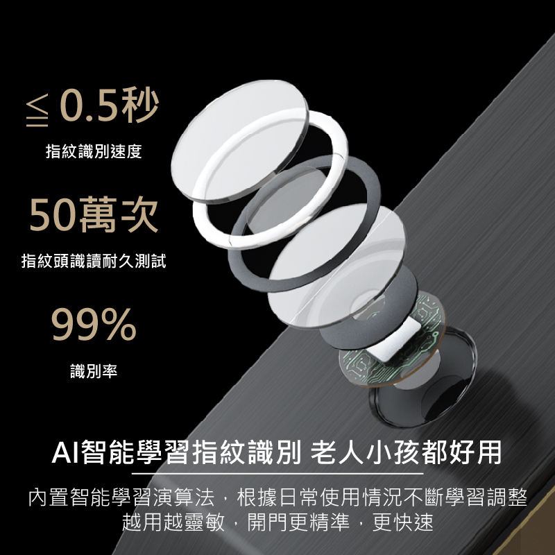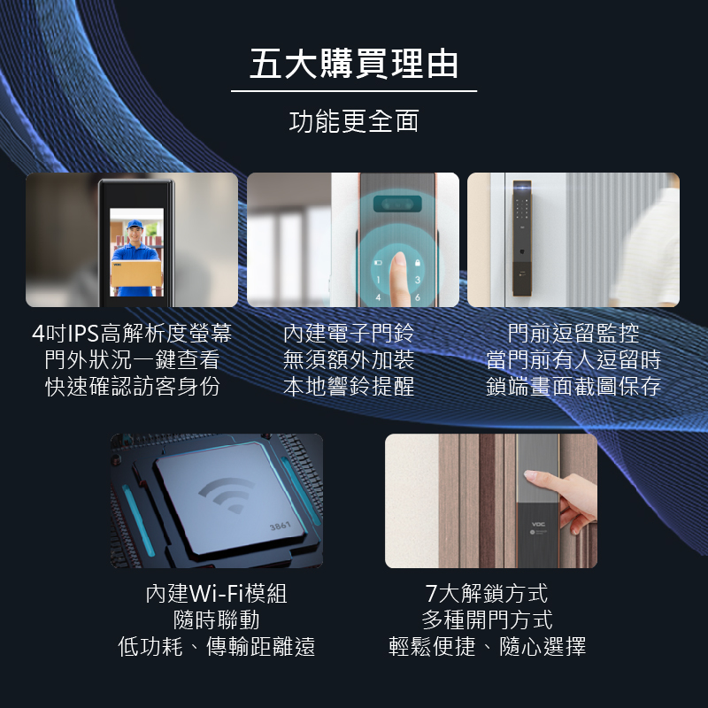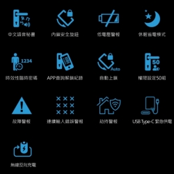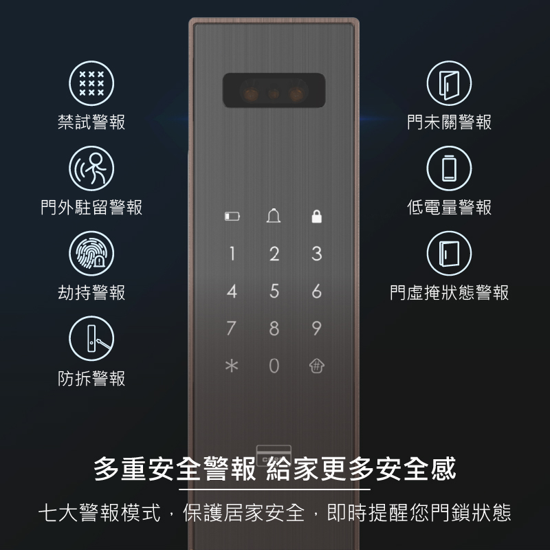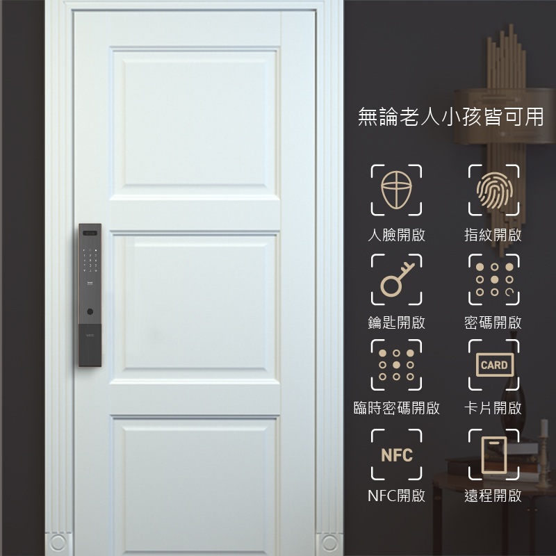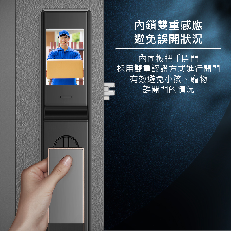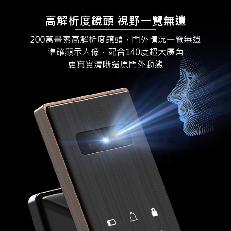 視訊鏡頭具備紅外線功能,可全天候看清門外視野,支援AI人臉識別演算法,能辨識各種面容資訊,下次使用時能更快速完成辨識,鎖體內建5,000mAh大容量鋰電池,充滿一次電約可使用 60 天,當電量過低時,手機App自動推播低電通知,內、外門鎖採用航空級別合金材質,面板表面採用IML工藝,霧面質感搭輔以絲紋理,不易沾染指紋和灰塵。同時搭配側邊的金屬色邊框,給人一種高貴精緻的感覺,適用市面上絕大多數的門扇。